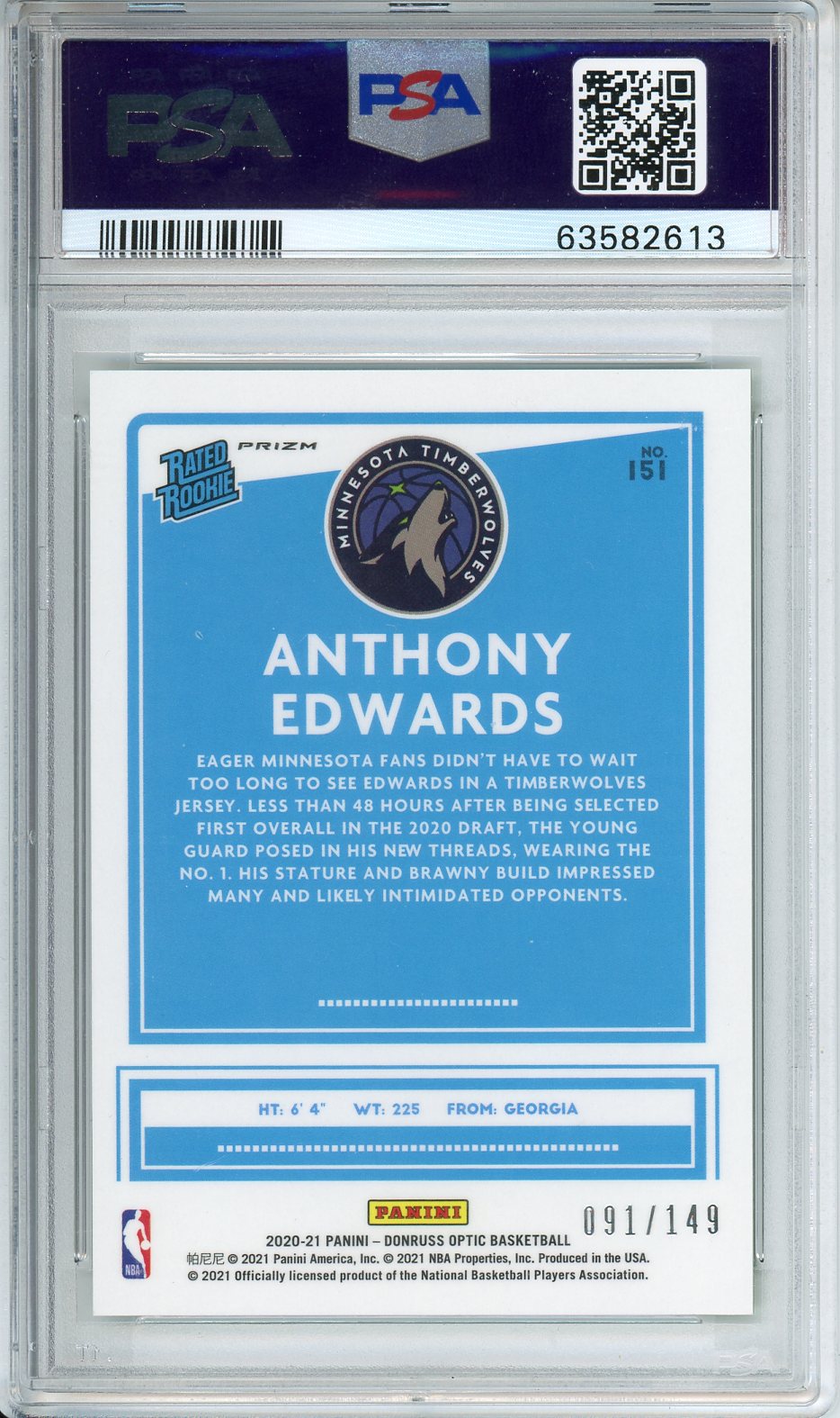 2020-21 Panini Donruss Optic Anthony Edwards RC #151 Lime Green /149 MINT PSA 9